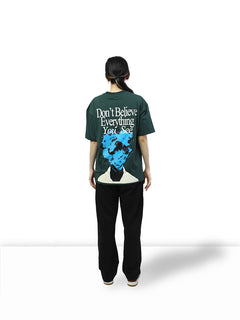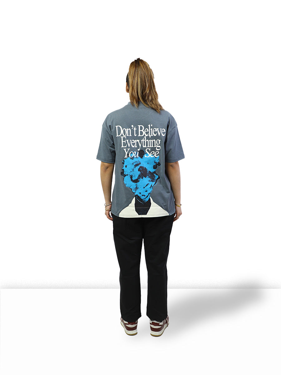 This design challenges the way we interpret reality. The melting, abstract face in electric blue symbolizes distorted perceptions, reminding us that not everything is as it seems. Paired with the bold serif text, “Don’t Believe Everything You See”, the message is clear—question, think, and look beyond the surface.